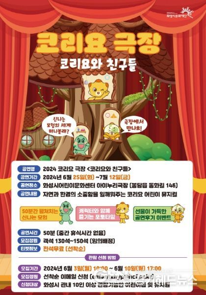 경기헤드뉴스 임수연 기자 | (재)화성시문화재단은 오는 6월 25일부터 코리요 극장 '코리요와 친구들'을 운영한다.