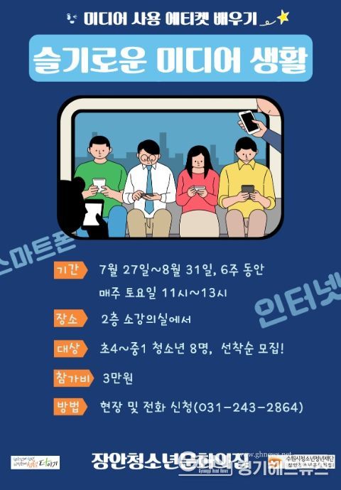 경기헤드뉴스 임수연 기자 | 수원시청소년청년재단 장안청소년문화의집은 청소년들을 대상으로 7월 27일부터 8월 31일까지 ‘2024. 슬기로운 미디어 생활’ 프로그램을 진행할 예정이다.