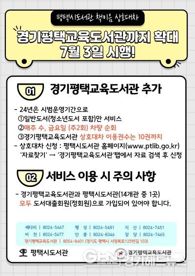 이번 상호대차 서비스 확대 시행으로 소속기관이 달라 별개로 운영되던 교육청 소속의 경기평택교육도서관 장서까지 가까운 도서관에서 빌려볼 수 있어 도서관 소장 자료에 대한 시민들의 접근이 편리해졌고 도서 이용률 또한 증가할 것으로 기대된다.