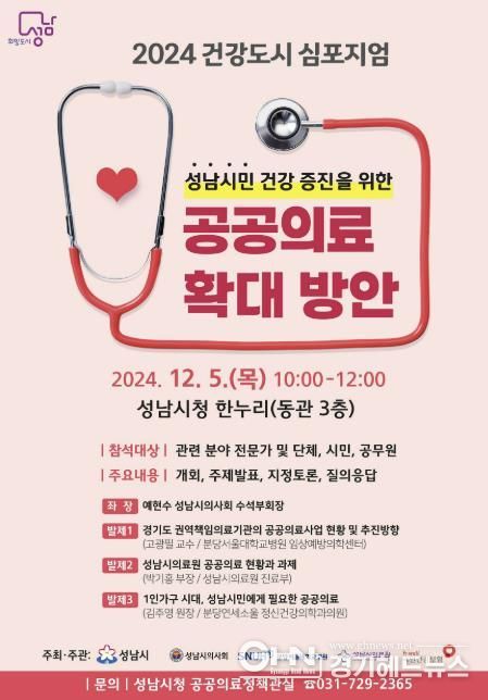 경기헤드뉴스 성미연 기자 | 성남시는 오는 12월 5일 오전 10시 시청 한누리에서 ‘성남시민 건강 증진을 위한 공공의료 확대 방안’을 주제로 건강도시 심포지엄을 개최한다.