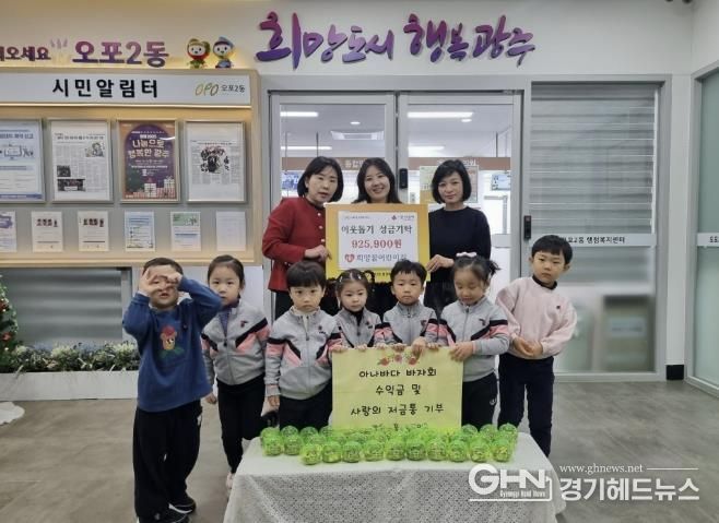경기헤드뉴스 성미연 기자 | 우방희망꿈 어린이집 원아들은 지난 12일 광주시 오포2동 행정복지센터를 방문해 성금 92만5천900원을 기탁했다.