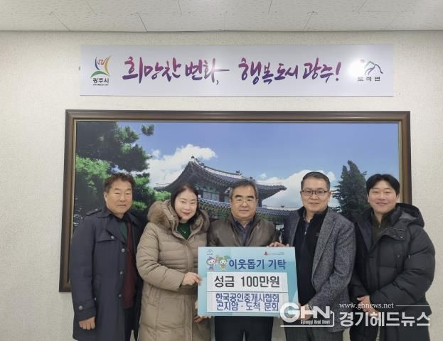 경기헤드뉴스 성미연 기자 | 한국공인중개사협회 곤지암·도척 분회 회원들은 지난 16일 연말을 맞아 광주시 도척면 행정복지센터를 방문, 성금 100만 원을 기탁했다.