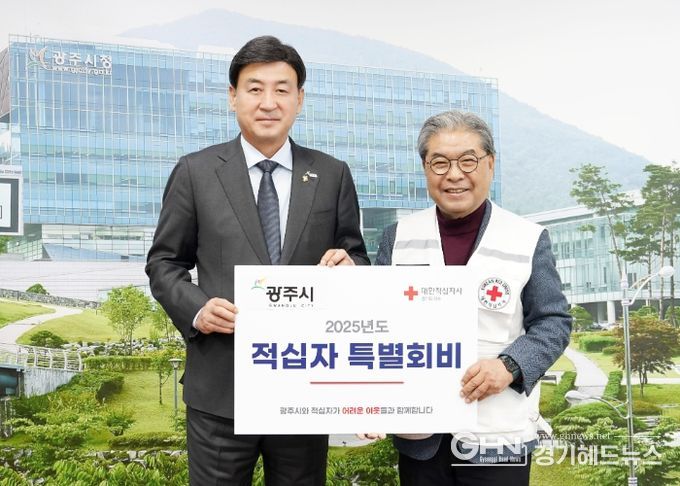 경기헤드뉴스 성미연 기자 | 방세환 광주시장은 27일 시장실에서 이재정 대한적십자사 경기도지사 회장에게 2025년도 적십자 특별회비 100만 원을 전달했다.