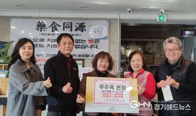 경기헤드뉴스 성미연 기자 | 광주시 신현동에 위치한 푸주옥 본점은 30일 신현동 행정복지센터를 방문해 2024년 한 해 동안 푸주옥 매장에서 판매한 과자 수익금을 기탁했다.