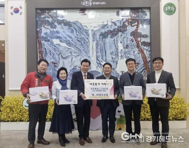 경기헤드뉴스 성미연 기자 | ㈜장수산업 최창환 회장과 임원진들은 14일 오포1동 행정복지센터를 방문해 어려운 이웃에게 전달해 달라며 경추 베개 1천200개(1억8천만 원 상당)를 기탁했다.