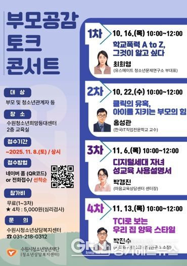 경기헤드뉴스 성미연 기자 | 수원시청소년청년재단 청소년상담복지센터는 청소년기 자녀 양육에 필요한 정보를 제공하고 부모의 역량을 강화하기 위해 ‘2025년 부모공감 토크콘서트’를 오는 10월 16일부터 11월 13일까지 총 4회에 걸쳐 운영한다.