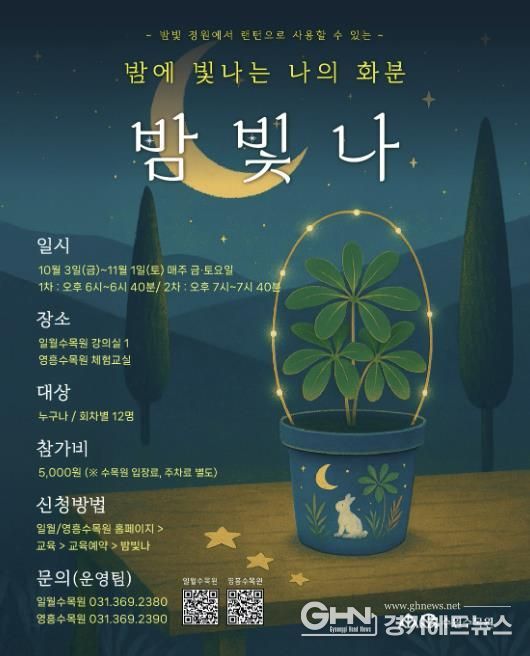 경기헤드뉴스 임수연 기자 | 수원특례시는 일월·영흥 수목원에서 10월 3일부터 11월 1일까지 매주 금·토요일 야간에 열리는 행사 ‘밤빛정원’에서 다양한 체험 프로그램들을 운영한다.