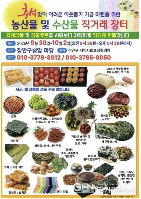 경기헤드뉴스 성미연 기자 | 수원시 장안구 지역사회보장협의체는 민족 최대의 명절 추석을 맞아 오는 9월 30일부터 10월 2일까지 3일간 장안구청 앞 광장에서 ‘추석맞이 농수산물 직거래장터’를 개최한다.