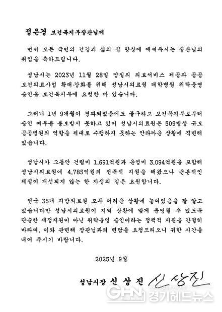 이어 “성남시의료원이 지역 상황에 맞게 운영될 수 있도록 단순한 재정지원이 아닌 위탁운영 승인이라는 정책적 지원이 반드시 필요하다”며 “이와 관련해 장관님과의 면담을 요청드린다”고 밝혔다.