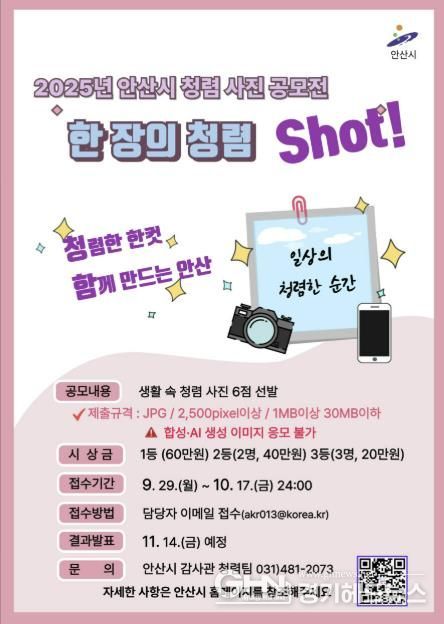 경기헤드뉴스 성미연 기자 | 안산시는 청렴문화 확산과 시민 공감대 형성을 위해 ‘2025 한 장의 청렴, Shot! 사진 공모전’을 개최한다고 30일 밝혔다.