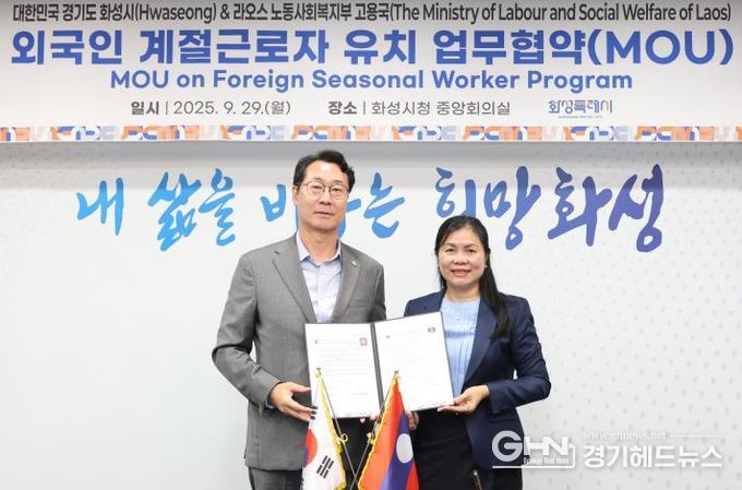 경기헤드뉴스 성미연 기자 | 화성특례시가 지난 29일 라오스 노동사회복지부 고용국(The Minisry of Labour and Social Welfare of Laos)과 외국인 계절근로자 유치 업무협약(MOU)을 체결했다.