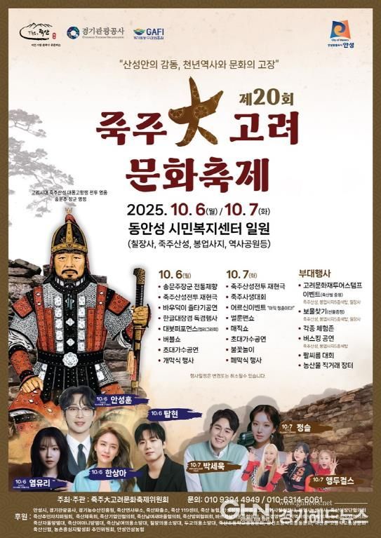 죽주대고려문화축제위원회는 오는 10월 6일부터 7일까지 이틀간 동안성시민복지센터 일원에서 제20회 죽주대고려문화축제를 연다고 밝혔다. 올해 축제는 ‘산성안의 감동, 천년역사와 문화의 고장’을 주제로, 송문주 장군과 죽주산성 전투의 역사적 의미를 기리고 지역 문화예술을 널리 알리기 위해 마련됐다.