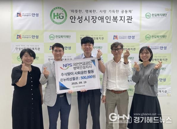 경기헤드뉴스 성미연 기자 | 사회복지법인 한길복지재단에서 수탁하고 있는 안성시장애인복지관은 지난 9월 29일 국민연금공단 평택안성지사로부터 사회공헌활동으로 50만원 상당의 온누리 상품권을 후원받았다고 밝혔다.