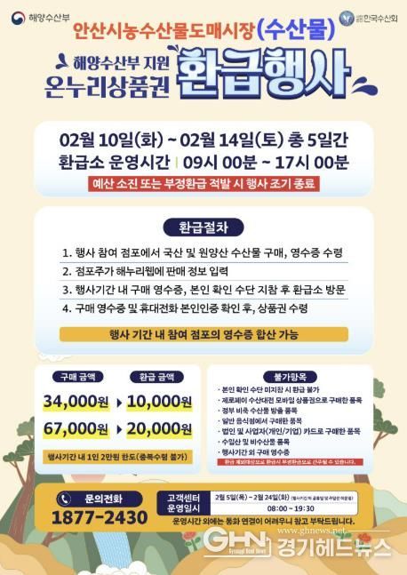 경기헤드뉴스 임채헌 기자 | 안산시는 설 명절을 맞아 국산 수산물 소비 촉진과 도매시장 활성화를 위해 오는 10일부터 14일까지 5일간 ‘2026년 설 온누리상품권 환급행사’를 개최한다고 5일 밝혔다.