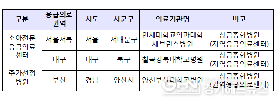 경기헤드뉴스 임수연 기자 | 보건복지부는 10월 19일 연세대학교의과대학세브란스병원(서울), 칠곡경북대학교병원(대구), 양산부산대학교병원(경남) 이상 3개 의료기관을 소아전문응급의료센터로 추가 선정했다고 밝혔다.