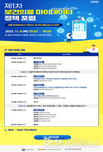 경기헤드뉴스 임수연 기자 | 보건복지부는 오는 11월 4일 오후 3시 20분 『제1차 보건의료 마이데이터 정책포럼』을 용인세브란스병원(경기도 용인시 소재) 대강당에서 개최한다고 밝혔다.