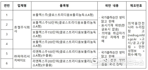 국가출하승인 위반 품목은 ▲㈜파마리서치바이오 리엔톡스주100단위, 리엔톡스주200단위 ▲휴젤주식회사 보툴렉스주, 보툴렉스주50단위, 보툴렉스주150단위, 보툴렉스주200단위다.