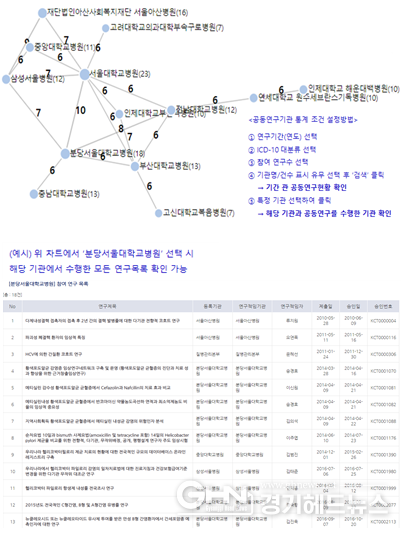 또한, 기관 간 공동연구현황은 등록된 임상 연구를 통합·도표화(매핑, mapping)하여 제공함으로써, 임상 연구 참여기관 선정에 참고할 수 있다.