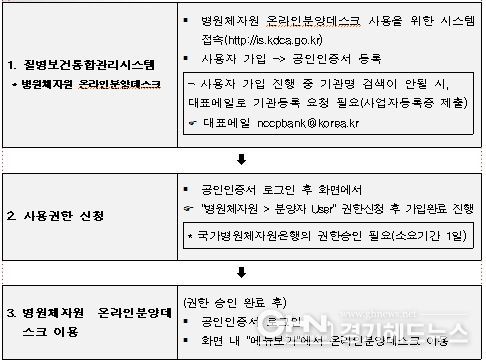 병원체자원 분양신청은 국가병원체자원은행 누리집 내 '병원체자원 온라인분양테스크'가능하며, 분양신청공문, 병원체자원 분양신청서, 병원체자원 관리·활용계획서, 시설·장비 보유 증명서 등의 서류를 제출해야 한다.