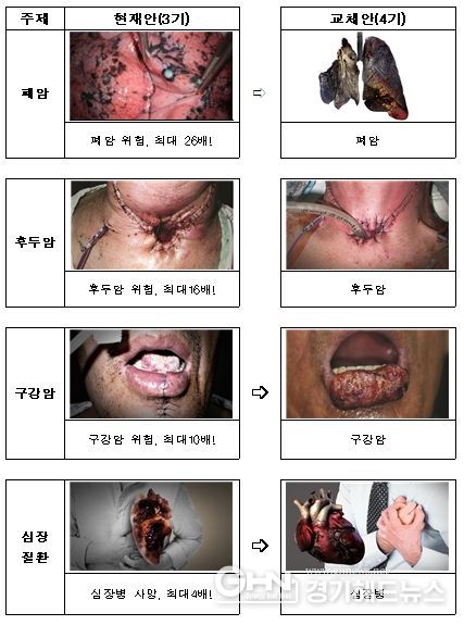 경기헤드뉴스 임수연 기자 | 보건복지부는 담뱃갑에 새롭게 표기할 제4기 경고그림 및 문구(안) 12개를 확정하고, 「담뱃갑포장지 경고그림등 표기내용(보건복지부 고시)」 개정(안)을 행정예고(4.13.~5.3.)한다고 밝혔다.