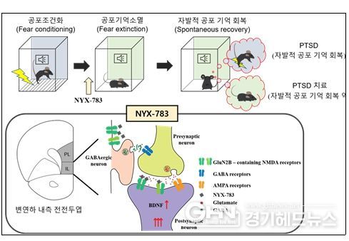 연구진은 외상후 스트레스 장애 동물 모델에 공포 상황 24시간 후 NYX-783을 주입하였으며, 공포기억 재발이 억제됨을 확인했다. 분석 결과 변연하 내측 전전두엽 내 흥분성 신경세포의 GluN2B 소단위체 단백질을 포함한 NMDA수용체가 활성화됐다.