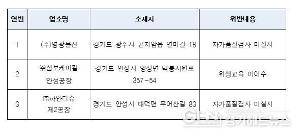 지방자치단체와 합동으로 일회용 젓가락 등 위생용품 제조업소 243곳을 점검한 결과, 「위생용품 관리법」을 위반한 3개 업체를 적발했으며, 위반 내용은 자가품질검사 미실시(2곳), 위생교육 미이수(1곳)이다.