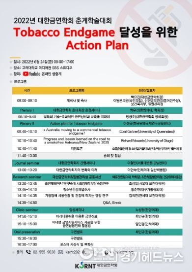 경기헤드뉴스 임수연 기자 | 질병관리청(청장 백경란)과 대한금연학회(회장 백유진)는 6월 24일, '2022년 대한금연학회 춘계학술대회'를 개최한다고 밝혔다.