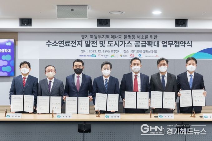 김동연 지사는 8일 경기도청에서 백영현 포천시장, 이충우 여주시장, 김덕현 연천군수, 김영문 한국동서발전 사장, 전동수 대륜이엔에스 대표이사, 사극진 코원에너지서비스 대표이사와 이런 내용을 담은 ‘경기 북동부지역 에너지 불평등 해소를 위한 수소연료전지 발전 및 도시가스 공급확대 업무협약서’에 서명했다.
