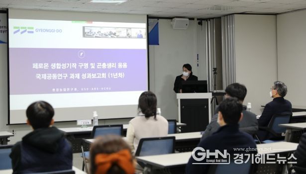 경기헤드뉴스 성미연 기자 | 경기도농업기술원에서는 21일 미국 농업 연구청(USDA ARS) 연구책임자 등이 참석한 가운데 ‘페로몬 생합성기작 구명 및 곤충생리 응용기술 개발’ 2단계 공동연구에 대한 온라인 성과보고회를 개최했다.