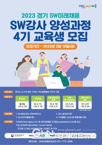 소프트웨어 강사 양성과정 교육생 모집 내용은 경기SW미래채움 누리집 공지사항에서 확인할 수 있으며 보다 자세한 내용은 경기도 정보기획담당관 정보문화팀으로 문의하면 된다.