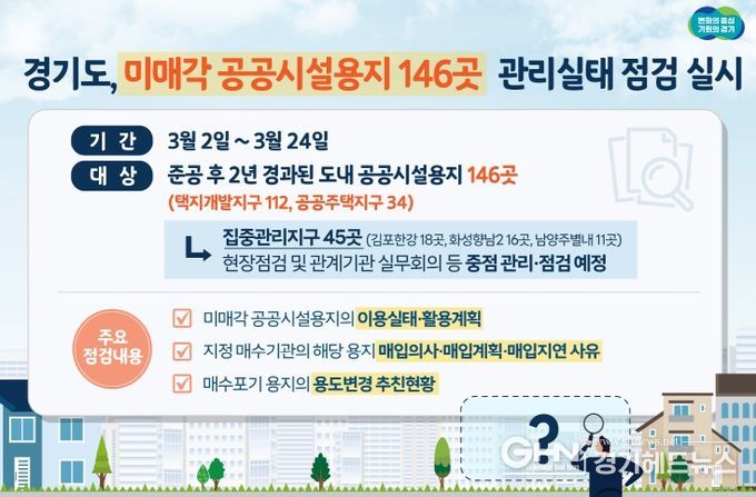 경기헤드뉴스 성미연 기자 | 경기도가 준공 후 매각이 제대로 이뤄지지 않아 입주민들의 불편이 우려되는 택지개발·공공주택지구 내 미매각 공공시설 용지 146곳에 대한 관리실태 점검을 3월 2일부터 24일까지 실시한다.