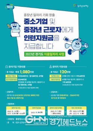 경기헤드뉴스 성미연 기자 | 경기도와 경기도일자리재단이 베이비부머의 안정적 일자리 창출을 위한 ‘경기도 이음 일자리 사업’을 추진하기로 하고 참여기업을 3월 20일까지 모집한다.