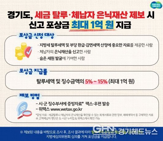 경기헤드뉴스 성미연 기자 | 경기도는 지방세 탈루 세액이나 체납자의 은닉재산을 신고하는 제보자에게 포상금 최대 1억 원을 지급한다고 19일 밝혔다.