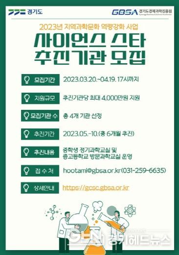 ‘사이언스 스타’는 경기도가 과학에 대한 청소년의 이해와 흥미를 높이고 소외지역 청소년 대상 현장 중심의 과학강연, 과학 분야 진로 탐색 등 미래 과학 인재 양성을 추진하는 ‘지역 과학문화 역량 강화 특화사업’으로, 추진기관 4곳을 선발할 계획이다.