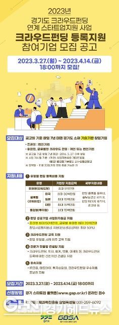 경기헤드뉴스 성미연 기자 | 경기도와 경기도경제과학진흥원은 도내 새싹기업(스타트업)의 민간 투자유치 확대를 지원하기 위해 ‘2023 크라우드펀딩 연계 스타트업 지원사업’을 추진한다고 27일 밝혔다.