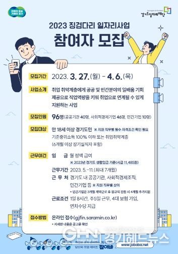 경기헤드뉴스 성미연 기자 | 경기도와 경기도일자리재단은 취업 취약계층 등을 위한 경력 형성형 일자리 창출 지원사업인 ‘2023년 징검다리 일자리 사업’에 참여할 구직자를 모집한다.