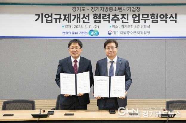염태영 경기도 경제부지사와 이상창 경기지방중소벤처기업청장은 11일 오후 경기도청 상황실에서 이런 내용을 담은 ‘기업규제개선 협력 추진 업무협약’을 체결했다.