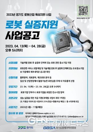 경기헤드뉴스 성미연 기자 | 경기도와 경기도경제과학진흥원은 오는 28일까지 ‘2023년 로봇 실증 지원 사업’에 참여할 기업을 모집한다.