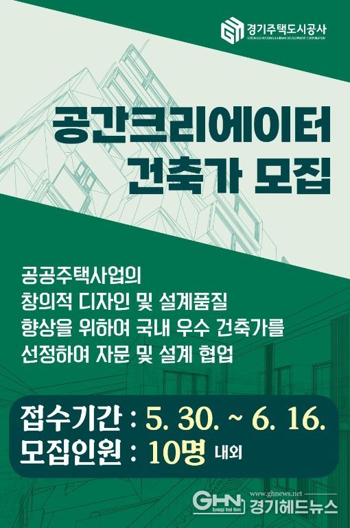 경기헤드뉴스 성미연 기자 | 경기주택도시공사(GH)가 ‘GH 공간크리에이터’ 모집 공고를 내고, 5월 30일부터 6월 16일까지 국내 우수 건축가를 모집한다.