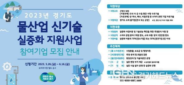 경기헤드뉴스 성미연 기자 | 경기도는 ‘2023년 물산업 신기술 실증화 지원사업’에 참여할 물기업을 16일까지 추가 모집한다.