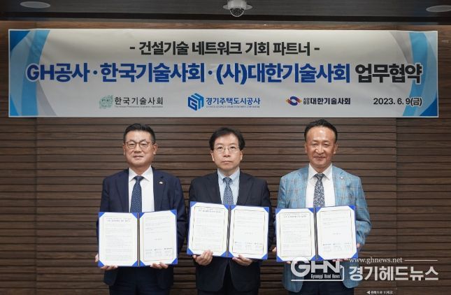 경기헤드뉴스 성미연 기자 | 경기주택도시공사(GH)가 한국기술사회, (사)대한기술사회와 9일 오후 GH 본사에서 건설기술 네트워크 기회파트너 업무협약(MOU)을 체결했다.