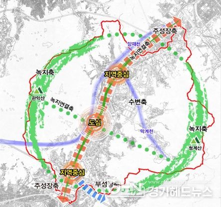 도시공간구조는 3기 신도시 개발, 광역교통망 확충 등 대내외적 여건 변화와 주변 지역과의 연계성 등을 고려해 기존 1 중심 2 부심에서 1 도심(중심) 2 지역 중심(남부·북부)으로 계획했다.