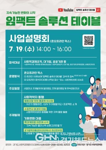 경기헤드뉴스 성미연 기자 | 경기도사회적경제원이 대기업, 공공기관, 사회적기업, 협동조합 등 다양한 이해관계자가 공동으로 참여해 문제를 정의하고 해결방안을 함께 도출해 가는 ‘임팩트 솔루션 테이블’을 개최한다.