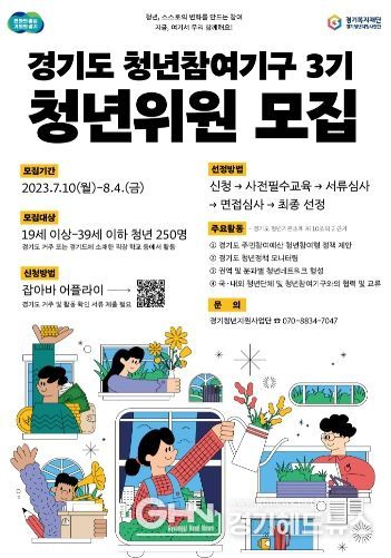경기헤드뉴스 성미연 기자 | 경기도가 도내 청년들의 도정 참여 기회를 확대하고 경기도 청년 정책을 발굴·제안하는 ‘경기도 청년참여기구’ 제3기에서 활동할 청년위원 250명을 8월 4일까지 모집한다.