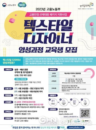 경기헤드뉴스 성미연 기자 | 경기도와 경기도일자리재단이 경기북부 섬유산업의 인력난 해소를 위해 다음달 8일까지 ‘텍스타일 디자이너 양성과정’ 2기 교육생을 모집한다.