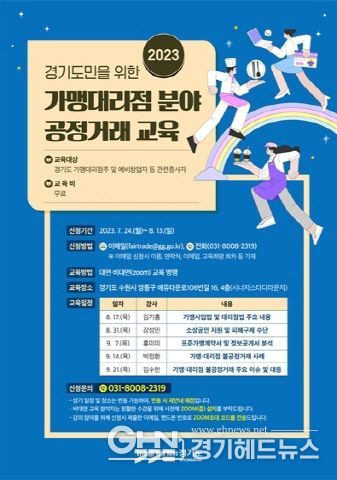 경기헤드뉴스 성미연 기자 | 경기도가 가맹·대리점 분야의 불공정거래 방지를 위해 도내 가맹대리점주 및 예비창업자를 대상으로 공정거래 교육을 17일부터 9월 21일까지 8월 17일, 31일과 9월 7일, 14일, 21일 등 총 5회 실시한다.