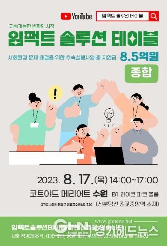 경기헤드뉴스 성미연 기자 | 경기도사회적경제원이 종합 임팩트 솔루션 테이블 행사를 17일 14시에 사업 참여자와 관심자 100명 대상으로 코트야드 메리어트 수원에서 개최한다.