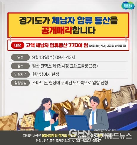 경기헤드뉴스 성미연 기자 | 경기도가 지방세 고액 체납자 가택수색을 통해 압류한 명품 시계, 가방 등 770여 점을 9월 13일 공개 매각한다.