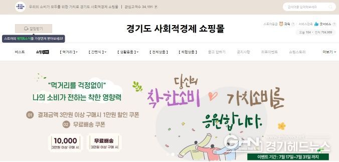 경기헤드뉴스 성미연 기자 | 경기도와 경기도주식회사가 경기도 사회적경제 기업제품 판매 촉진을 위해 오는 28일부터 9월 15일까지 ‘경기도 사회적경제 쇼핑몰에서 3만 원 이상 구매할 때 네이버 포인트 5천 원을 지급하는 이벤트를 한다.