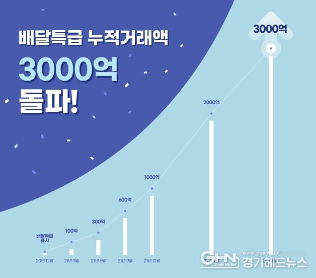 경기헤드뉴스 성미연 기자 | 경기도주식회사는 8월 15일 화요일 기준 경기도 공공배달앱 배달특급 총 누적 거래액이 3천억 원을 넘었다고 20일 밝혔다. 지난 2022년 9월 누적거래액 2천억 원을 넘긴데 이어 약 11개월 만의 새로운 기록 달성이다.